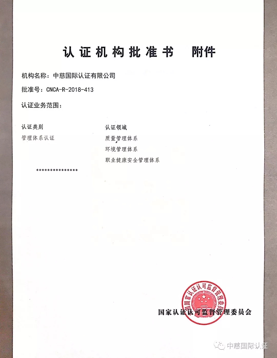 熱烈祝賀中慈國際認證獲得國家認監(jiān)委環(huán)境管理體系和職業(yè)健康安全管理體系認證資質(zhì)!